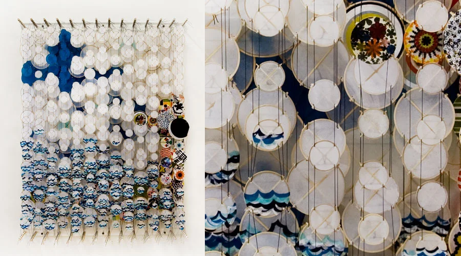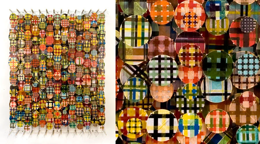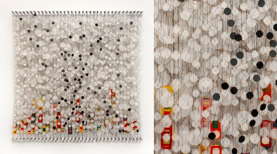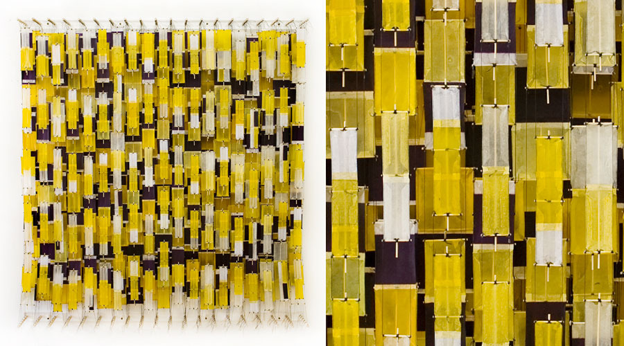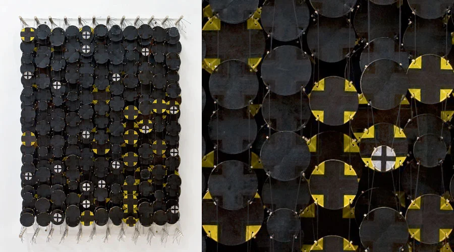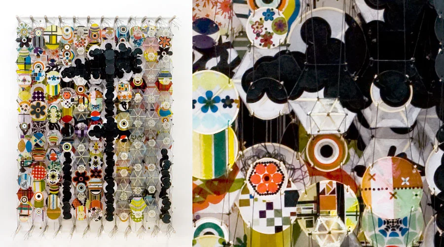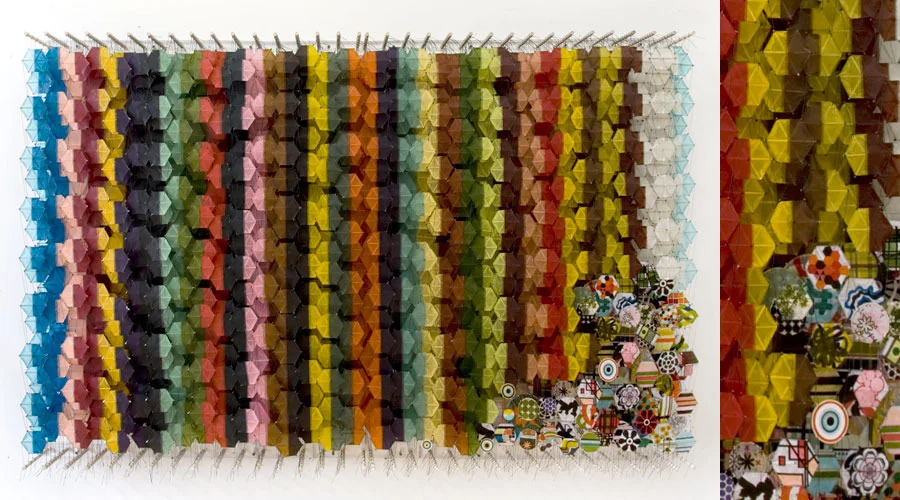 On 23 May 2009 the Mary Boone Gallery will open at its Chelsea location an exhibition of new works by JACOB HASHIMOTO. Jacob Hashimoto’s new work continues his longtime fascination with the intersections of painting and sculpture, abstraction and landscape. Each work in the exhibition is comprised of hundreds of small bamboo and paper kitelike elements. These kite elements are strung together in chains, and layers of these chains are stretched taught between short dowels that project from wall-mounted brackets, creating a densely layered and fragmented tapestry of image or pattern. The elements forming these tapestries are a solid color of paper, or a complex, collaged pattern of multicolored cut paper. While the individual components remain more or less abstract, overall, clusters of pattern, stripes, or waves of color are formed, giving the works a pictorial quality that suggests organic forms, vistas, scrolling video games, or even board games. Hashimoto’s working method is very open-ended, allowing him to sample art-historical references, icons of the every-day, and mismatched narratives within each composition.