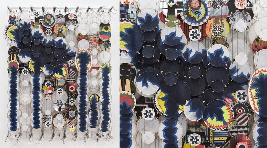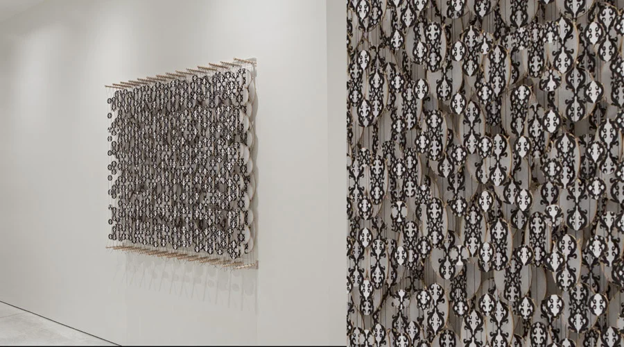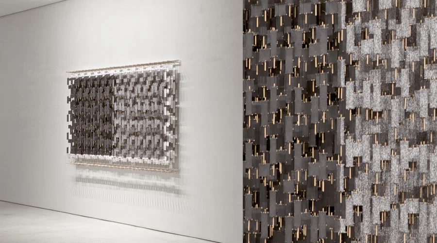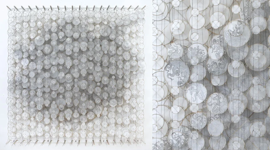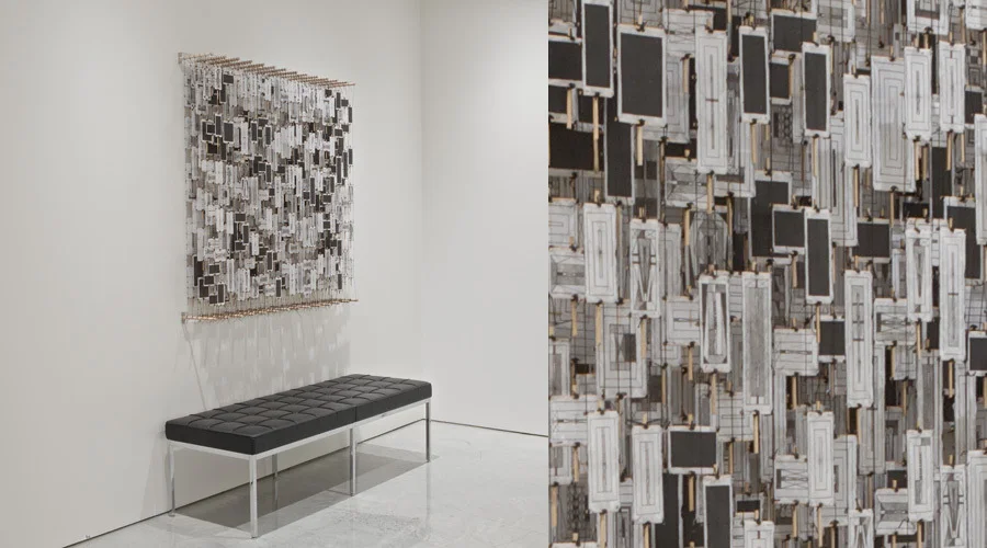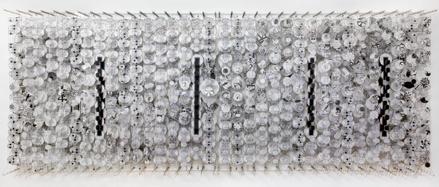 Jacob Hashimoto uses traditional kite-making techniques to create distinctive works comprised of hundreds of bamboo and paper elements strung together and suspended between parallel dowels to form fragmented and layered fields. The works take into account the spatial considerations of sculpture and the pictorial devices of painting, operating as a hybrid between what are conventionally separate disciplines. For this new body of work, Hashimoto references another artistic practice: each individual kite element portrays a graphite drawing. Values ranging from lightly hatched gray to dense black complement translucent white paper, replacing the kaleidoscope palette of cut paper collage evidenced in previous works. The subtle hand introduced by the traced and meandering pencil lines accentuates the intricate construction of the works’ foundation. The exhibition, 745 Fifth Avenue, is on view through 17 December 2011.