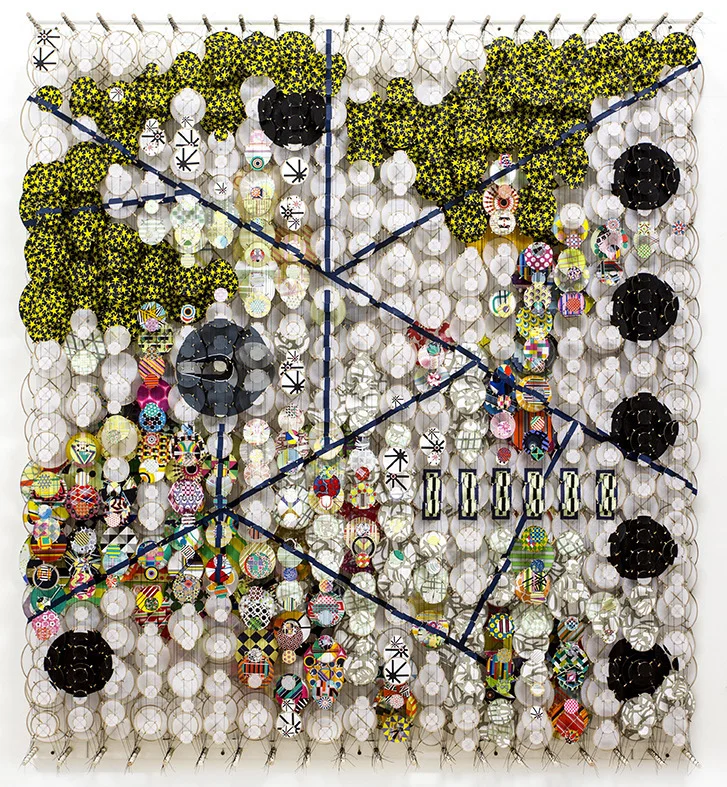 With their arrangement of discs suspended from string, Jacob Hashimoto's works - occupying a place between painting and sculpture - bear resemblance to models of a complex planetary system. For this exhibition, Hashimoto builds on this correlation to meditate on mankind's enduring fascination with creating order of the world. The quest for knowledge represented in ancient celestial maps and bygone charts of the unknown serve as inspiration for new imagery and a new color palette.